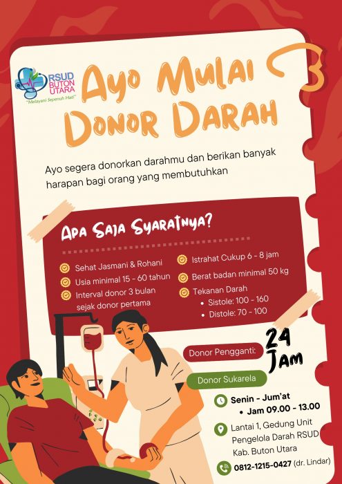 RSUD Kabupaten Buton Utara melalui Unit Pengelola Darah (UPD) mengajak masyarakat untuk ikut serta dalam kegiatan Donor Darah Rutin yang diselenggarakan setiap hari kerja. Kegiatan ini bertujuan untuk membantu memenuhi ketersediaan stok darah di rumah sakit sekaligus mengedukasi masyarakat tentang pentingnya donor darah bagi kesehatan.